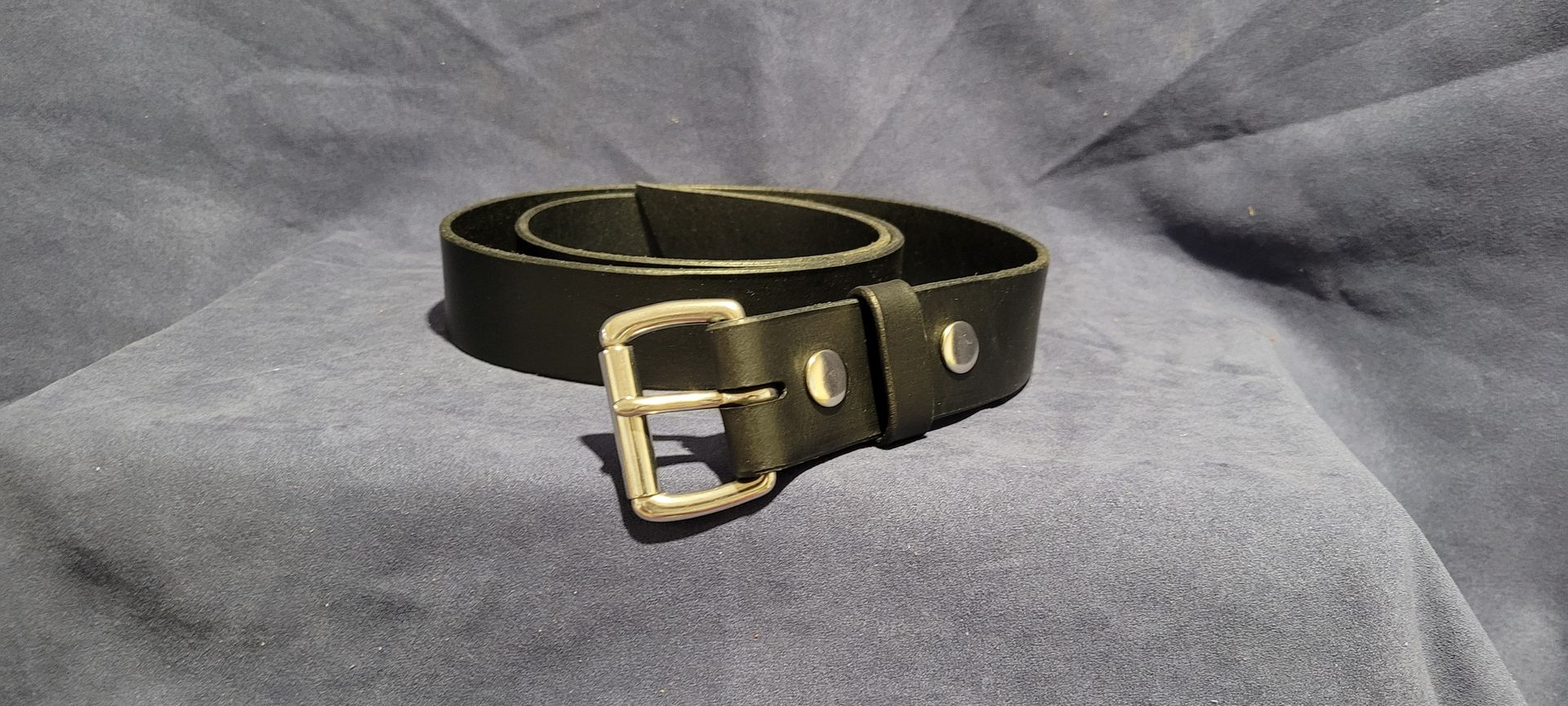 Black Water Buffalo 1 1/2" wide with silver snaps, featured with a silver roller buckle. Uncut, max length is 48" with out buckle.