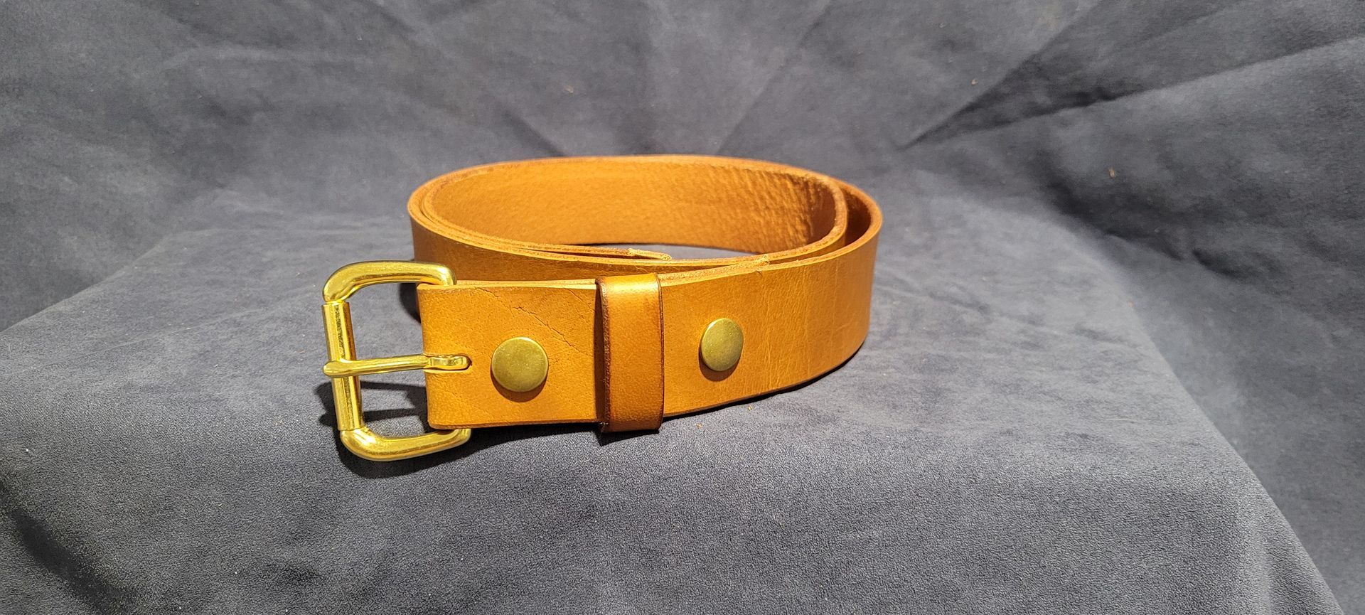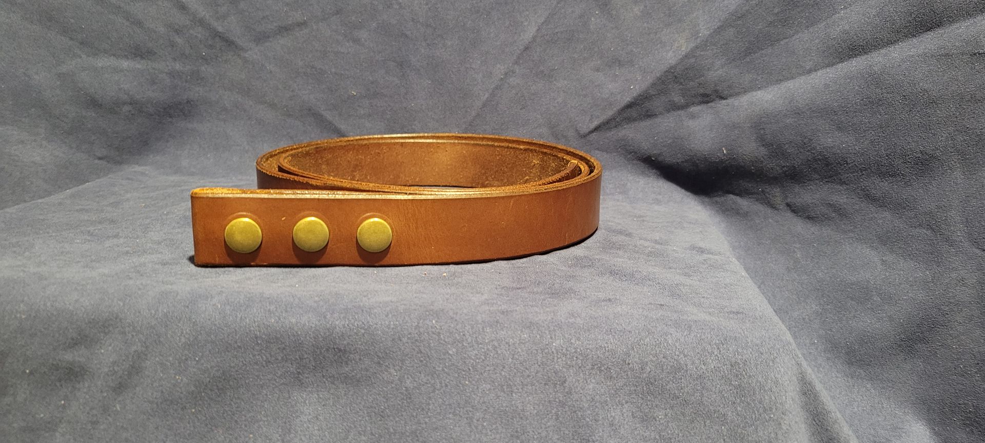 Tan Water Buffalo 1 1/2" wide with brass snaps, featured with a brass roller buckle. Uncut, max length is 43" without buckle.
