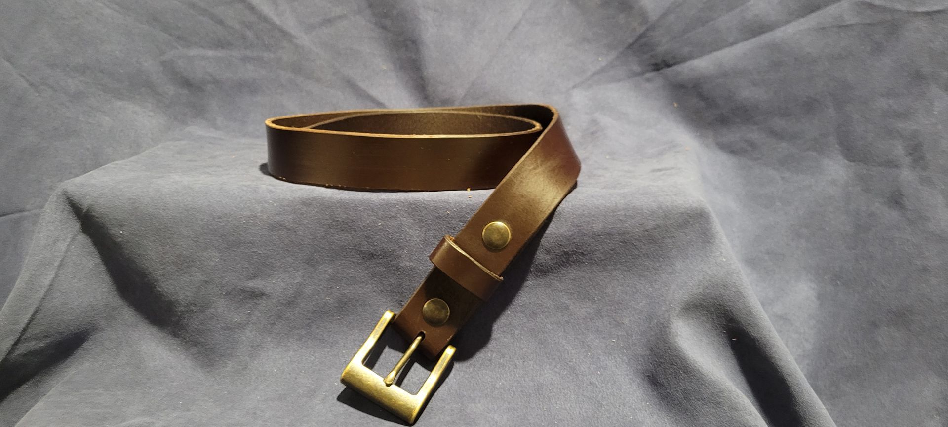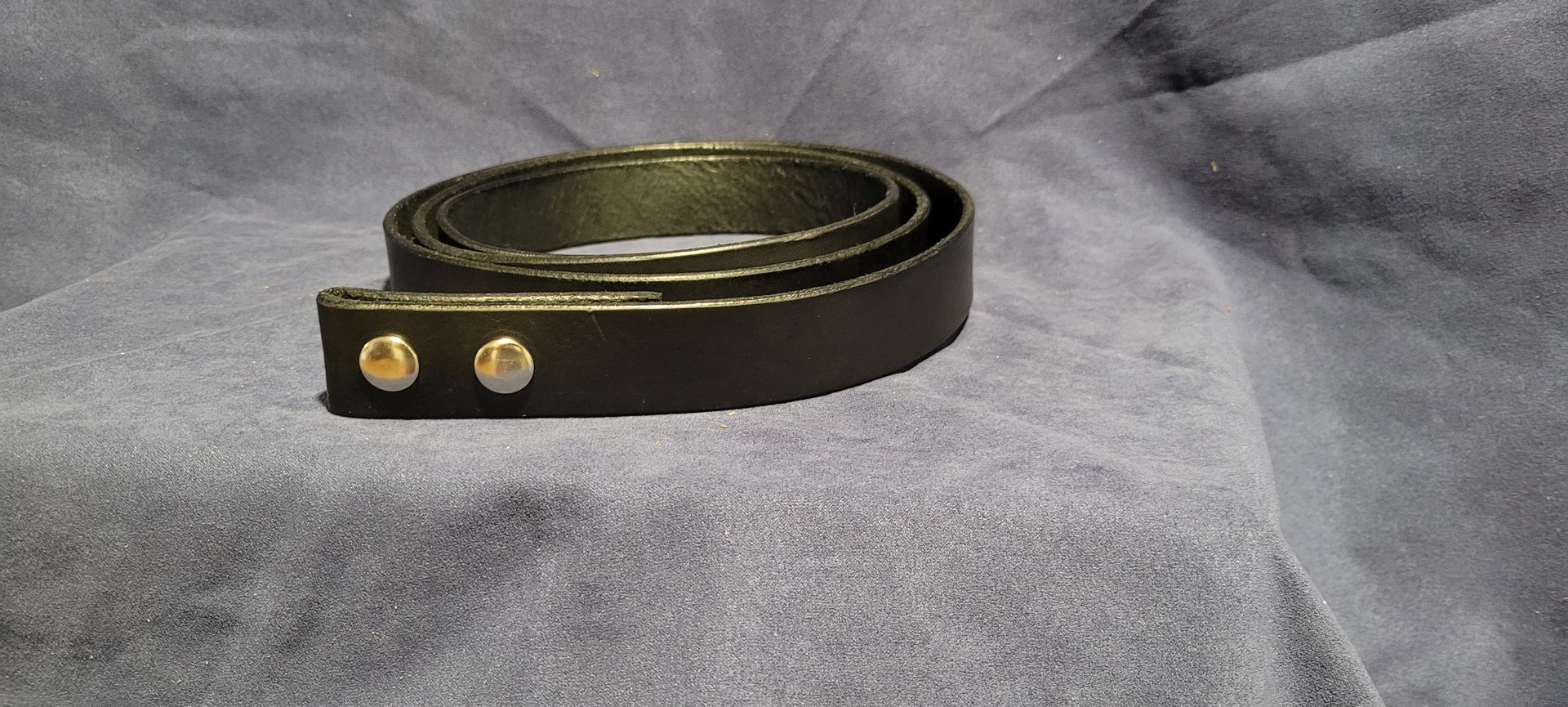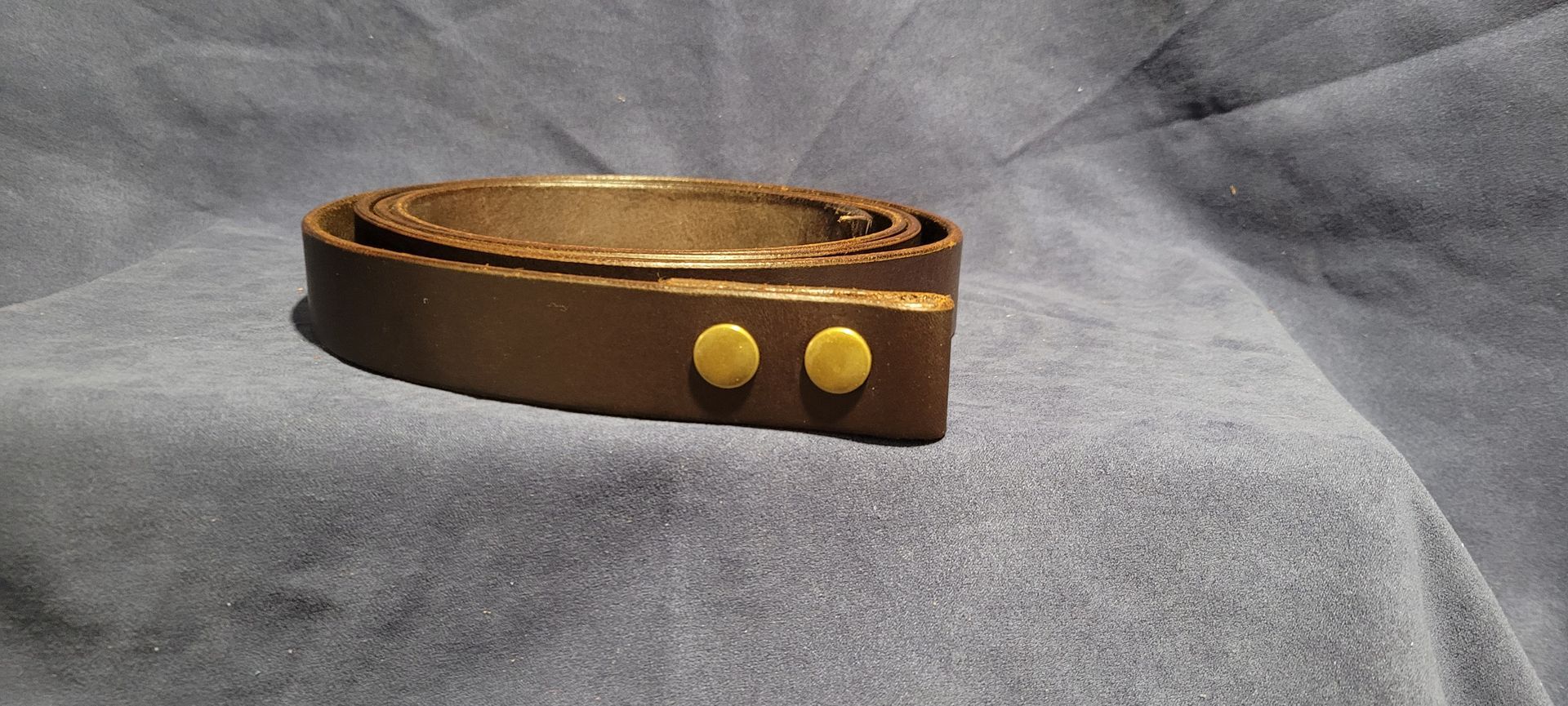 Dark Brown Water Buffalo 1 1/4" wide with antique brass snaps, featured with an antique brass buckle. Uncut, max length is 43" without buckle.